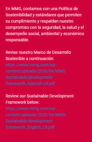 Estamos alineados con los estándares, estrategias y procesos de MMG, nuestro operador; y aplicamos procedimientos específicos para nuestra unidad minera a nivel local. Asimismo, consideramos esencial adecuar dichos estándares a la normativa legal vigente. En conjunto, estos elementos son prioritarios para nuestra toma de decisiones y actuación empresarial.